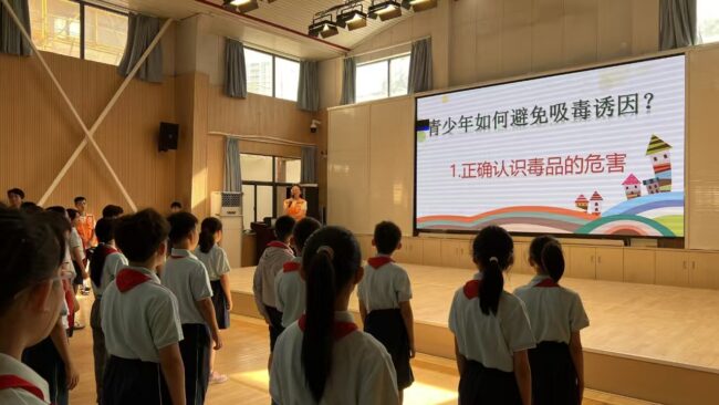 9月1日开学第一天,上海市虹口区海南中学举行升旗仪式,自强虹口北外滩街道的禁毒社工们借此契机走进校园,以 “珍爱生命、远离毒品” 为主题开展“开学第一课”的禁毒讲座,为全体师生筑牢青春防毒防线。