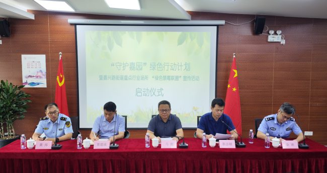 8月17日上午,虹口区嘉兴路街道牵头嘉兴路派出所、街道市场监管所在嘉兴路社区党建服务中心举行“守护嘉园”——绿色行动计划暨嘉兴路街道重点行业场所“绿色禁毒联盟”宣传活动启动仪式。