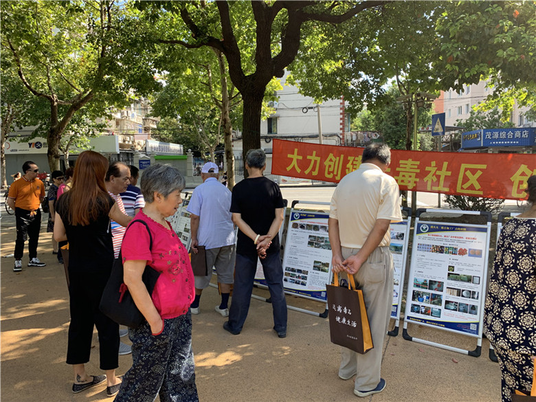 禁毒社工及志愿者们除了向来往的居民发放禁毒宣传手册,对于驻足观看禁毒展板的居民讲解毒品种类和禁毒知识,特别是张庙街道的禁毒专职干部赖海强,作为一名更具权威和说服力的志愿者,耐心地为居民们纠正对于吸毒是个人行为的错误思想,倡导人人参与禁毒,全民抵制毒品的新风尚。