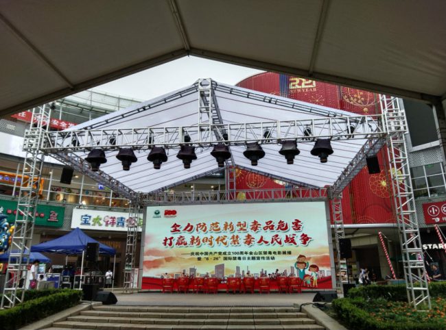 6月26日国际禁毒日当天晚上,金山区在百联购物中心广场举行“全力防范新型毒品危害 打赢新时代禁毒人民战争”——庆祝中国共产党成立100周年金山区禁毒电影展播暨“6·26”国际禁毒日主题宣传活动。