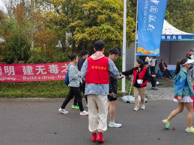 2024年4月13日,2024上海长江半程马拉松赛在崇明区陈家镇燃情开赛,陈家镇禁毒社工与禁毒志愿者在陈家镇自行车主题公园开展禁毒宣传。