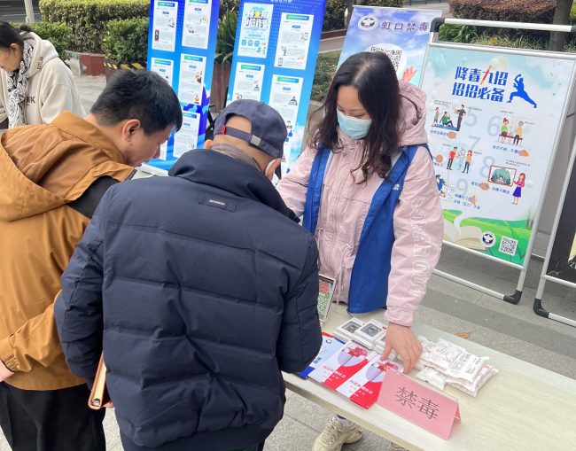 虹口区广中路街道平安办联合虹口区精神卫生中心,广中路社区卫生服务中心、街道计生、禁毒专职干部、自强虹口的禁毒社工一起在同心路159号虹口区美沙酮门诊门口开展防艾禁毒宣传活动……