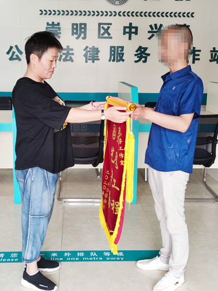 2020年7月7日上午,服务对象吴某来到自强崇明工作站小芳工作室,向同伴辅导员龚小芳献上一面锦旗。感谢小芳在他迷失自我的那段时间里尽心竭力的帮助。