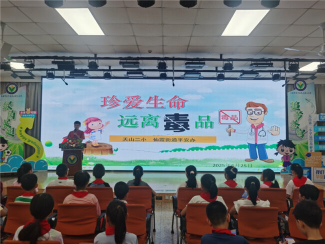 为了充分发挥学校毒品预防教育主阵地作用,扎实推进青少年毒品宣传教育,以迎接第38个“6.26”国际禁毒日到来为契机,2025年6月25日上午,仙霞街道平安办联合天山二小举行了“珍爱生命,远离毒品”禁毒宣传讲座暨禁毒游乐会。