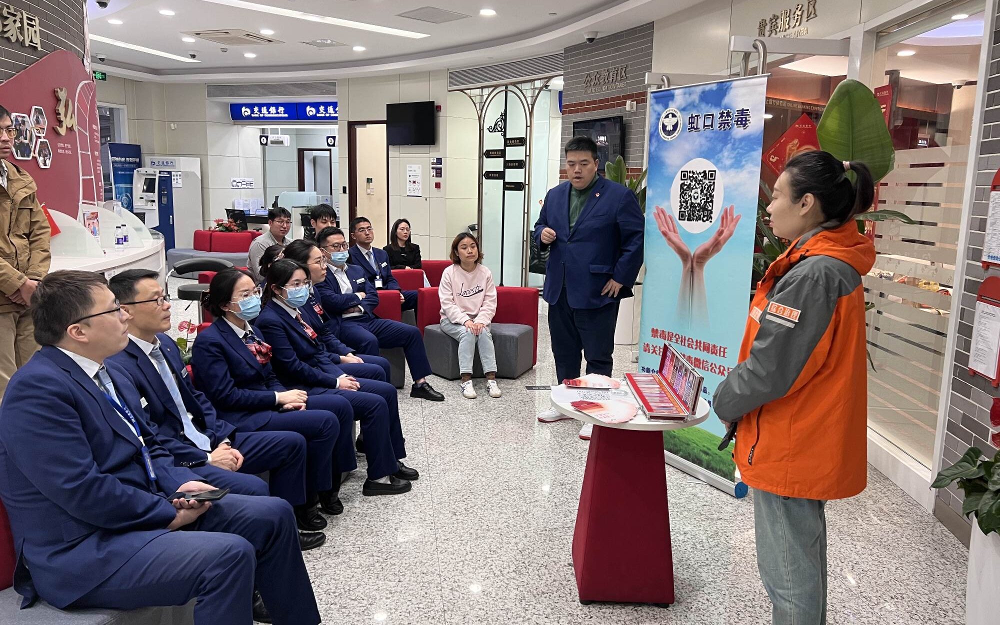 为加大禁毒宣传工作力度,筑牢禁毒防线,4月25日晚上,自强虹口四川北路街道的禁毒社工在银行营运结束后,对辖区内的交通银行网点开展禁毒宣传活动。